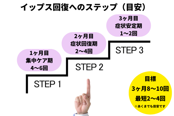 早ければ2~3回、約1ヶ月で良くなる方もいますし、8~10回、約3~6ヶ月で良くなる方もいます。
